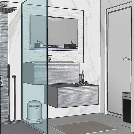 J’ai façonné l’espace bain aveugle pour le rendre lumineux et agréable. Dans un appartement masculin, on opte pour des matériaux bruts. Ainsi, les murs se parent d’un magnifique marbre blanc alterné mat, brillant et sérigraphié. Le meuble vasque aux reflets métalliques s’élève sur le mur en marbre de carrare mat pour beaucoup d’élégance. Sur un sol en béton ciré, J’ai installé une douche à l’italienne XXL très fonctionnelle. Quelques étagères permettent de ranger des produits pour homme et le linge de toilette. Pour conférer un peu de chaleur à l’espace, j’ai ajouté un radiateur sèche serviette , un tapis et un joli panier à linge.
